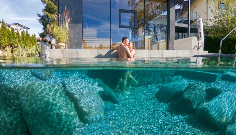 Per la zona del benessere del Majestic a Riscone abbiamo progettato una piscina biologica di prima classe. La piscina bio colpisce grazie alla sua acqua cristallina ed un design naturale. Esattamente la piscina giusta per il Majestic, quasi come il proprio laghetto di montagna.