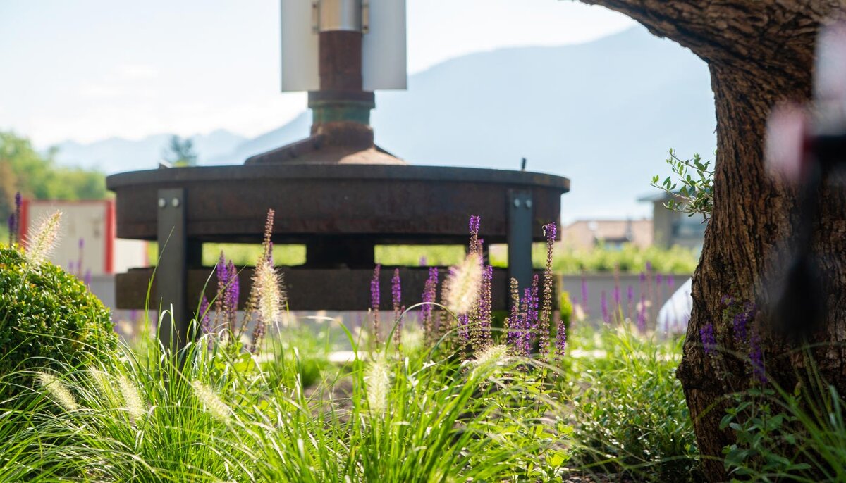 FÜR OBIBAU GMBHEin besonderes Pflanzenbeet entstand für die Residence Hofer by Obibau GmbH. Hier haben wir eine antike Turbine in ein mediterranes Beet eingebettet. Ein garantierter Blickfang. Gartengestaltung einmal anders.